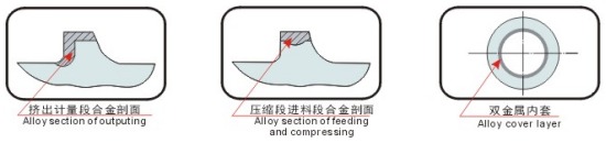 雙合金機筒就是在機筒內壁澆鑄一層2-3mm的耐磨、耐腐蝕、耐高溫的合金。其有效使用壽命比普通氮化機筒大大提高,對于加工工程塑料、氟塑料、聚砜、PPO特殊類型的塑料等,雙合金的優越性尤為明顯。